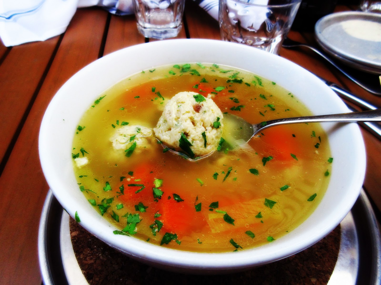 We settled for a place called Hops Culture because we were able to eat outside, away from any rich people who might scrutinize our parenting skills while Evan ran amok so that we could eat. I had Matzo Ball Soup.